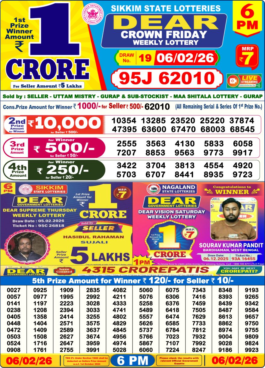 Dear Lottery Result 1 PM, 6 PM, 8 PM — Draw Result Date 06 February 2026 — Lottery Sambad Result & Dear Result Chart