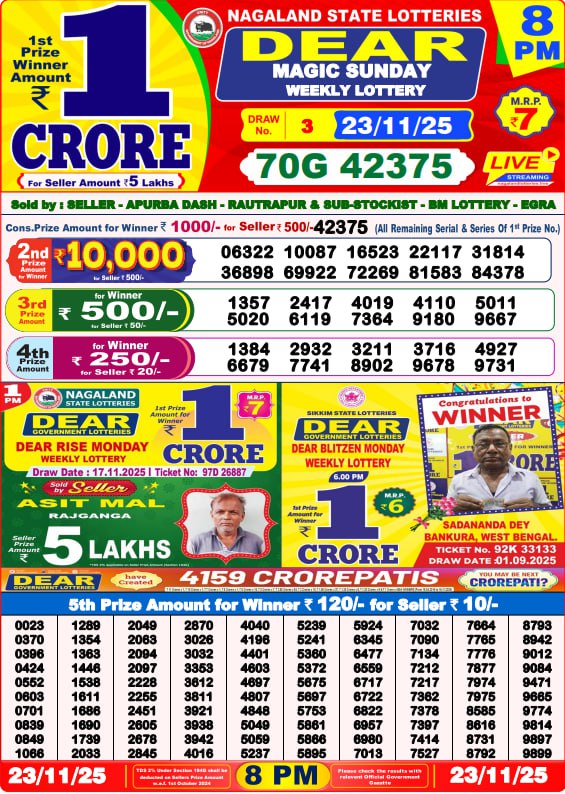 The Dear Lottery Result for today's draws is updated in real-time below. Check the winning numbers and claim your prize before the deadline. Stay updated for all the latest Dear Result charts and Dear Lottery Sambad results.
